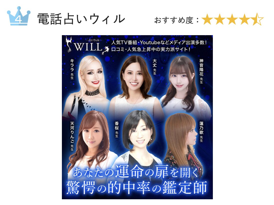 |  4位: 電話占いウィル | TVやメディア出演で著名人も占うトップクラス占い師多数在籍。 2013年から続く大手電話占いなので安心。今だけ最大10,000円分無料。 おすすめ占い師 ・千手結叶先生 ・香桜先生 ・天河りんご 公式サイトはこちら |
