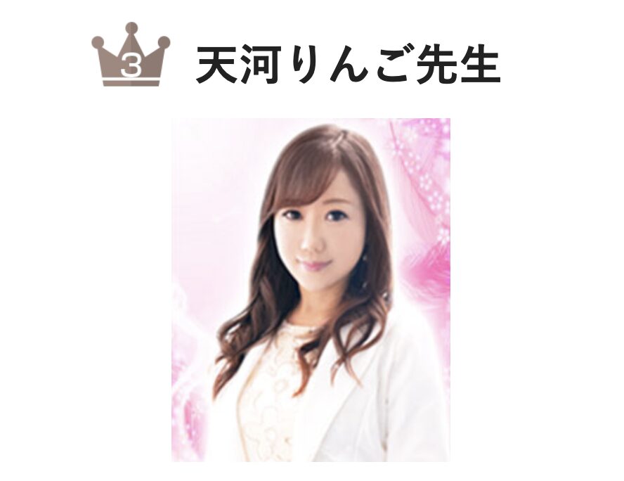|  3位 天河りんご 先生 | 霊能家系に生まれ育った天性の霊能力で当たりすぎる、願いが叶うと話題のウィルの大人気占い師。 鑑定歴25年、鑑定実績9万件以上。芸能界はもちろん、経営者、政治関係者も御用達にする凄腕鑑定士。 →天河りんご先生に占ってもらう |