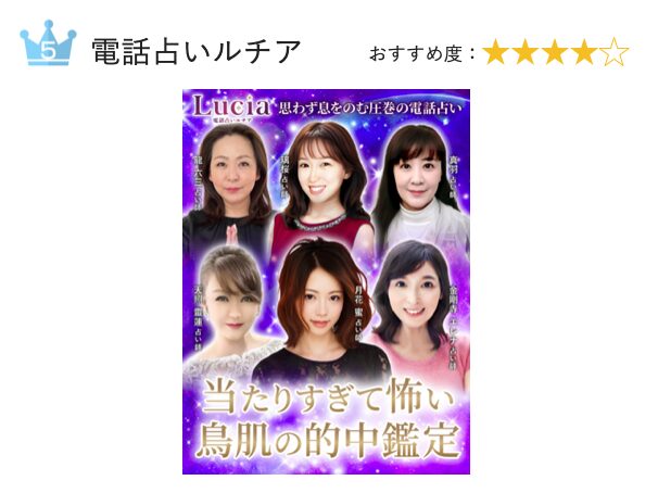 |  5位: 電話占いルチア | 新進気鋭の占いサイトで全国の実力派占い師が在籍する大注目の電話占いサイト。 運営会社は電話相談サービス15年以上の歴史を持つ大手なので安心。今だけ最大8,500円分無料。 おすすめ占い師 ・月花蜜先生 ・金剛寺エレナ先生 ・璃桜先生 公式サイトはこちら |