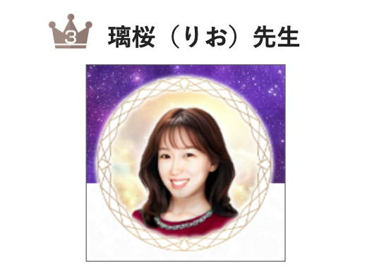 |  3位 璃桜先生 | 芸能人や有名アスリート御用達。ソウルシナリオを書き換え願望成就を実現させる超実力派占い師。 圧倒的な霊能力はもちろん、相談者の願望に合わせカスタマイズし真言を用いたオリジナル祈祷で好転を引き寄せる。 →璃桜先生に占ってもらう |